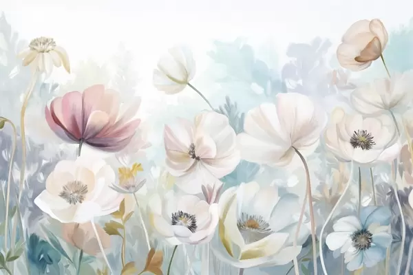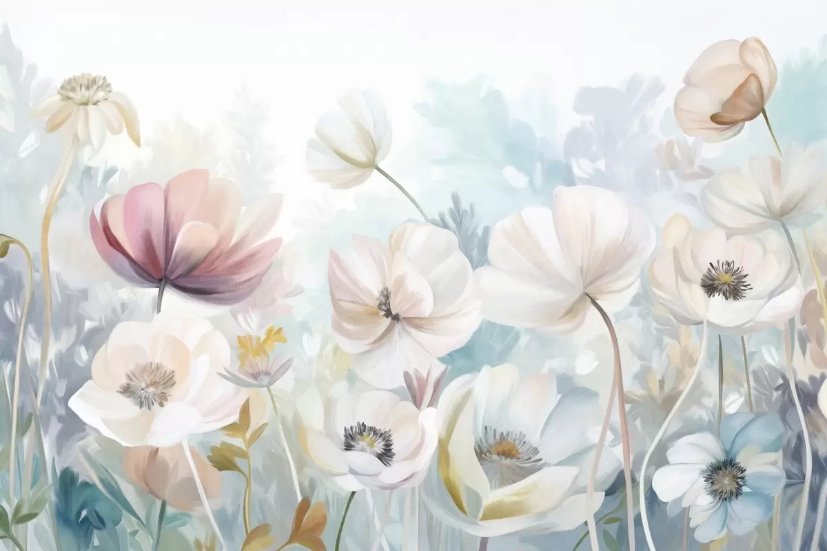 Тапете за зид Поље пастелно обојеног цвећа са нежним латицама, меким зеленим листовима, у сањивом, текстурираном акварел стилу бр. w09481