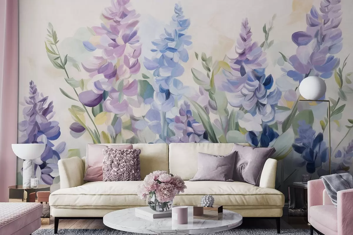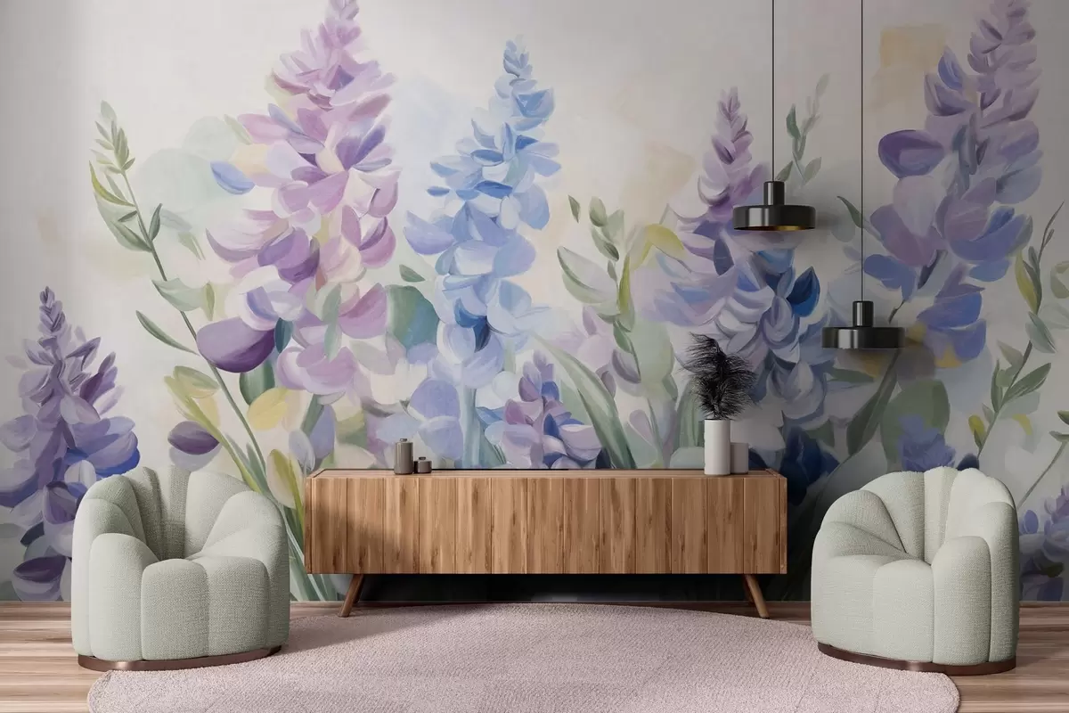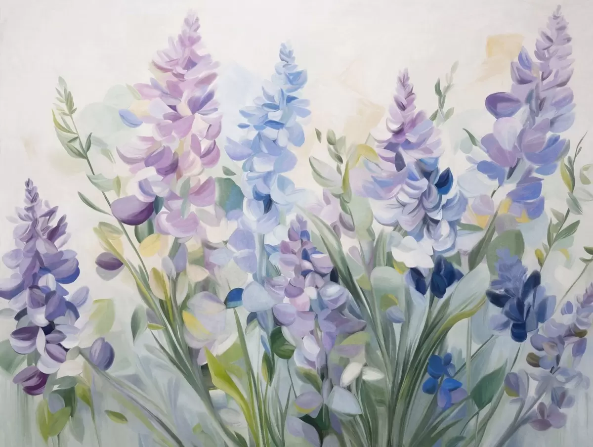 Тапете за зид Љубичасто и плаво текстурирано цвеће са плавим листовима, светла позадина, меки потези четкице, живе боје бр. w09482