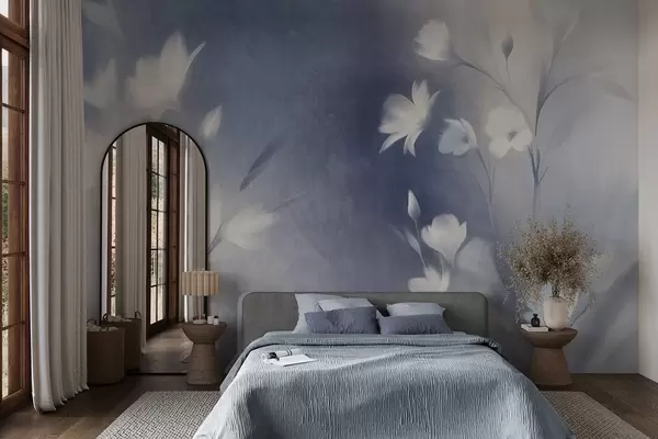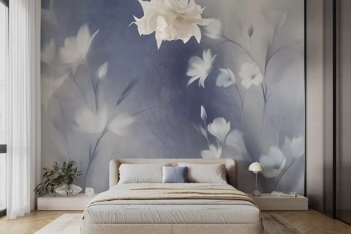 Тапете за зид Бели текстурирани цветови са дугим стабљикама, меки пупољци на замућеној позадини плавих и белих нијанси бр. w09484