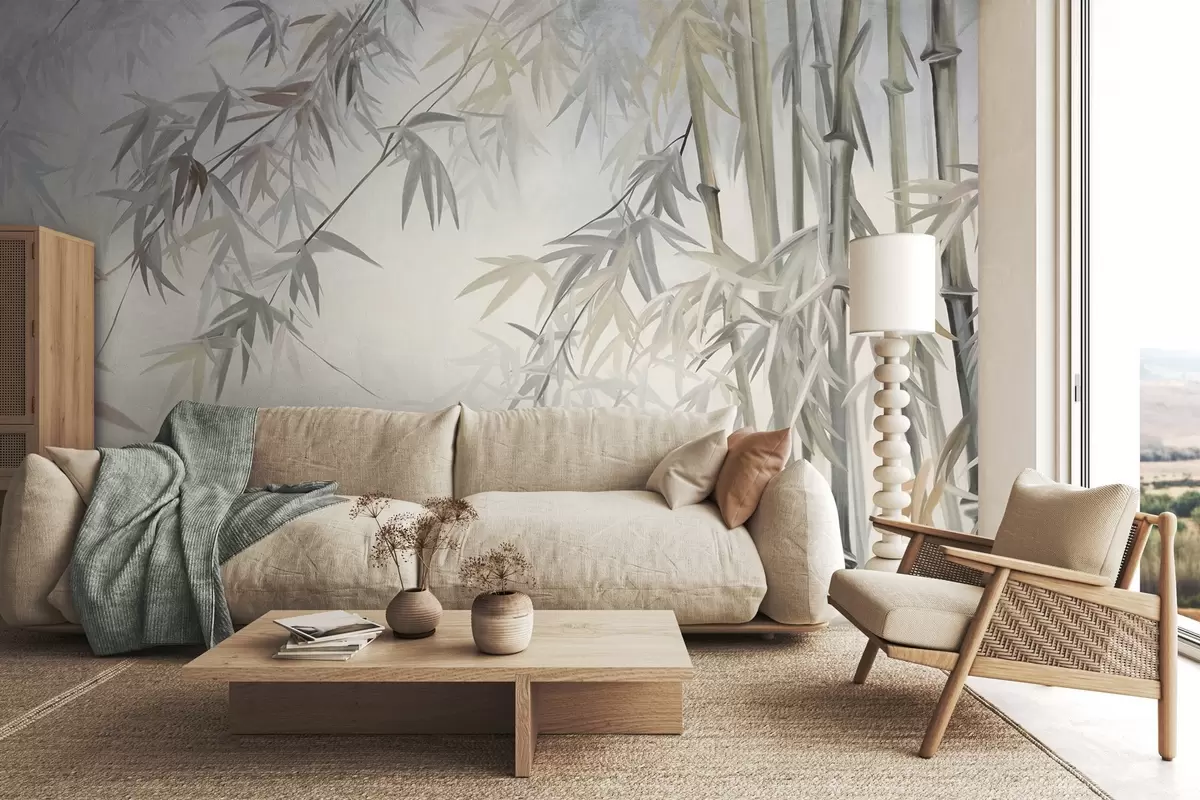 Тапете за зид Текстуриране стабљике и листови бамбуса у мекој, пригушеној палети боја сиве, беле и кремасте, минималистичка композиција бр. w09485