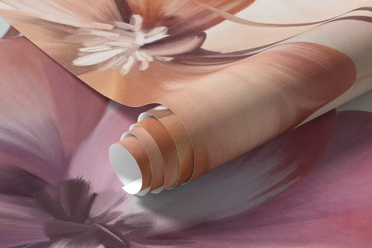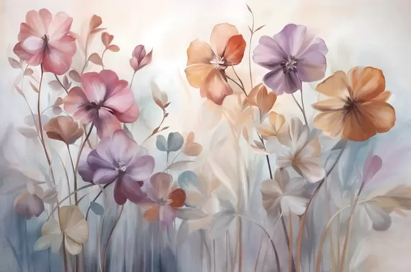Тапете за зид Текстурни цветни аранжман са ружичастим, љубичастим и наранџастим цветовима са зеленим стабљикама и листовима, нежне пастелне боје бр. w09486