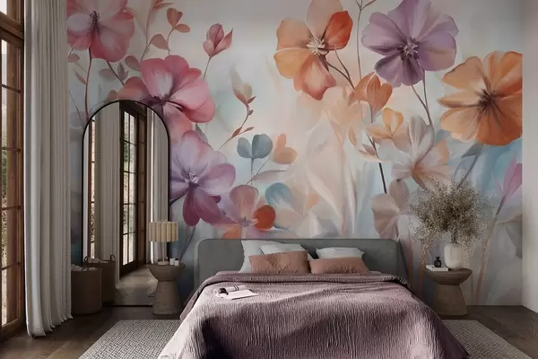 Тапете за зид Текстурни цветни аранжман са ружичастим, љубичастим и наранџастим цветовима са зеленим стабљикама и листовима, нежне пастелне боје бр. w09486