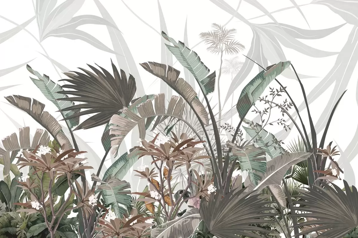 Тапете за зид Тропско текстурирано лишће са цвећем, палмама, цветовима плумерије, пастелним бојама, белом позадином, џунглом бр. w09488