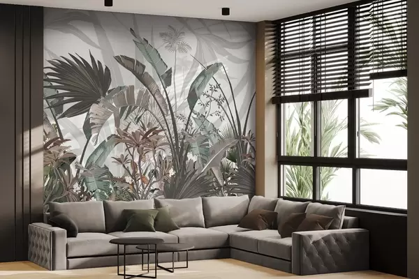 Тапете за зид Тропско текстурирано лишће са цвећем, палмама, цветовима плумерије, пастелним бојама, белом позадином, џунглом бр. w09488
