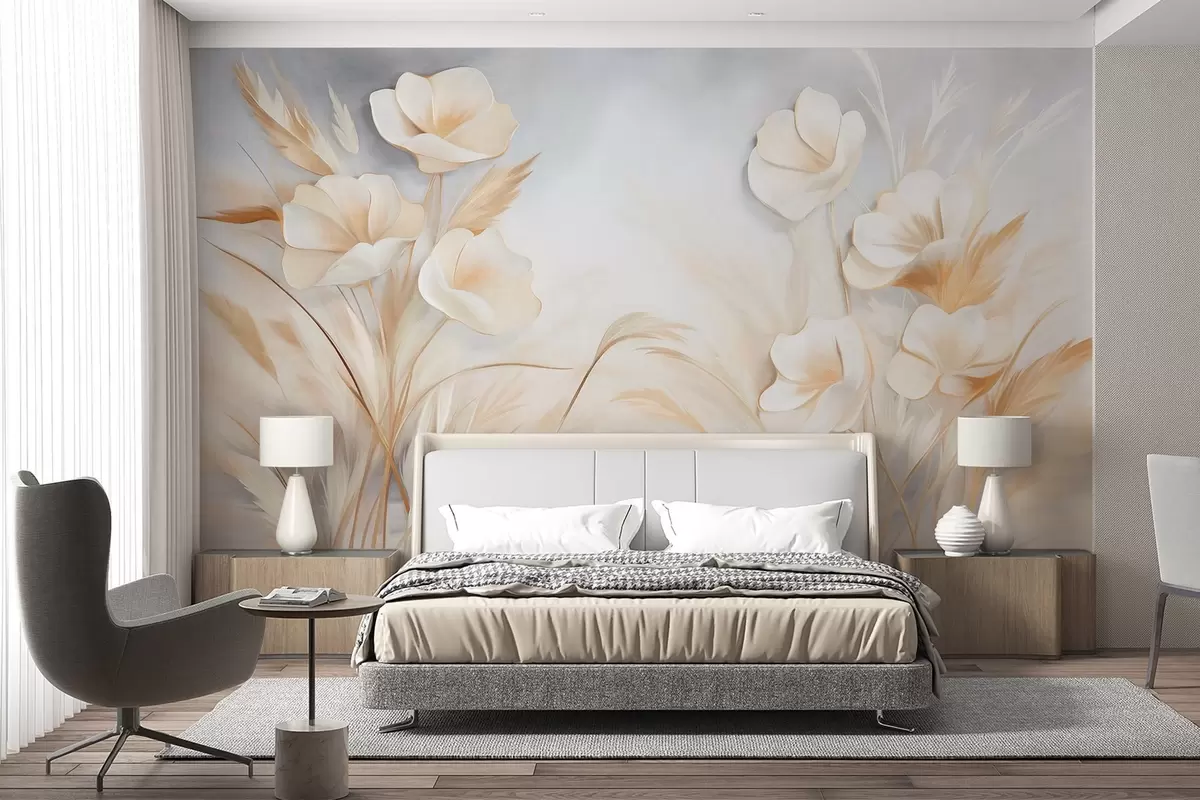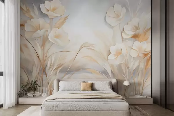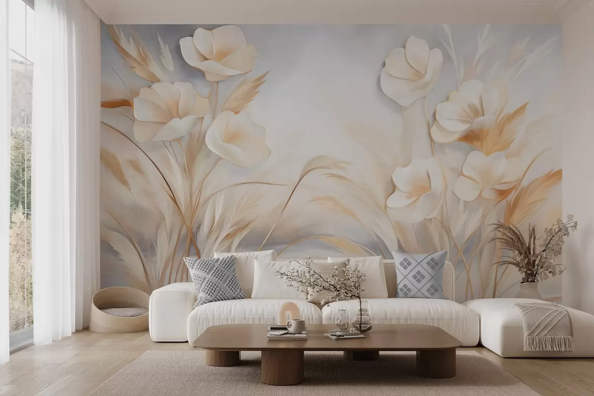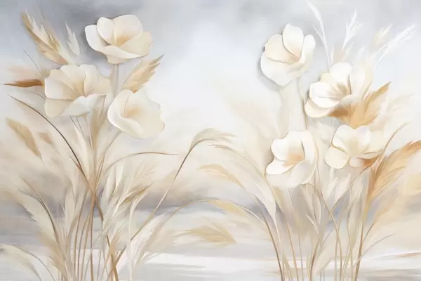 Тапете за зид Бело цвеће, беж трска и пампас трава, текстурирано, елегантно, минималистички стил, апстрактна позадина пејзажа бр. w09490