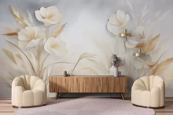 Тапете за зид Бело цвеће, беж трска и пампас трава, текстурирано, елегантно, минималистички стил, апстрактна позадина пејзажа бр. w09490