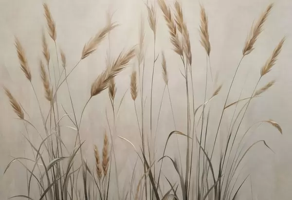 Тапете за зид Пшенично текстурирано поље са жутим класјевима зрна, беж позадина, природно осветљење, топли тонови, детаљни потези четкицом бр. w09493