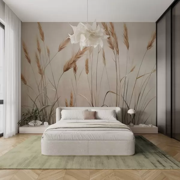 Тапете за зид Пшенично текстурирано поље са жутим класјевима зрна, беж позадина, природно осветљење, топли тонови, детаљни потези четкицом бр. w09493