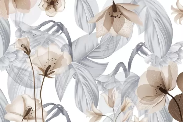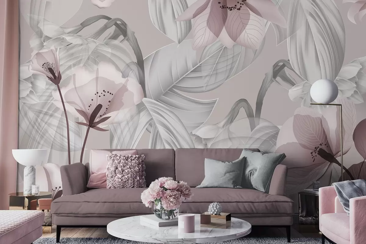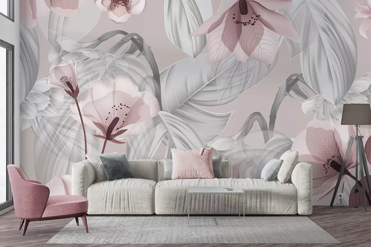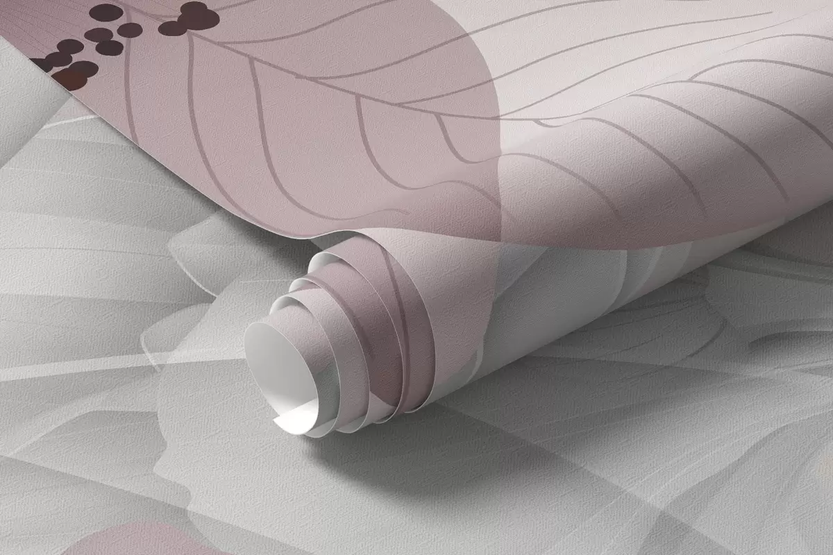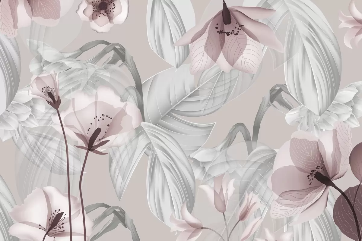 Тапете за зид Ружичасти цветови и сиви листови, цветна ботаничка позадина, елегантан дизајн, меке боје, лагани нежни детаљи бр. w09497