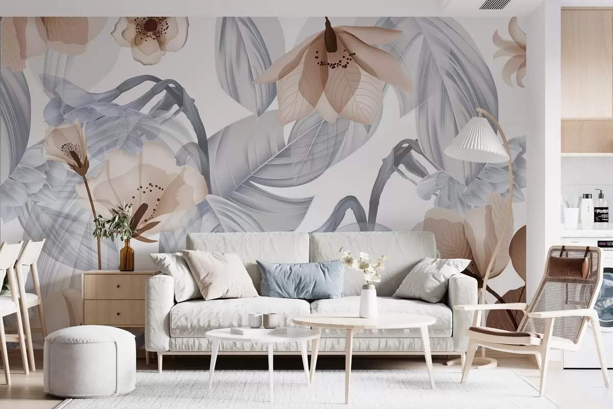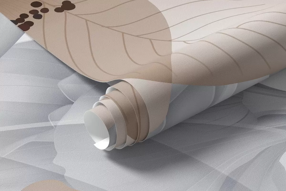 Тапете за зид Смеђе цвеће и сиво лишће, цветна ботаничка позадина, елегантан дизајн, меке боје, лагани нежни детаљи бр. w09497v1