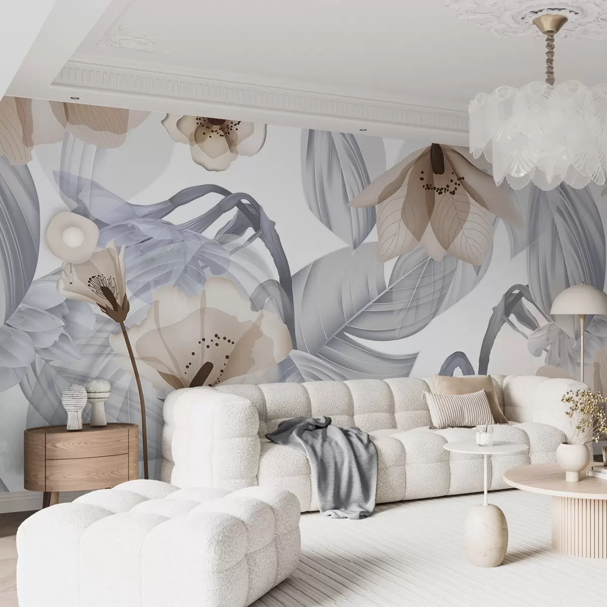 Тапете за зид Смеђе цвеће и сиво лишће, цветна ботаничка позадина, елегантан дизајн, меке боје, лагани нежни детаљи бр. w09497v1