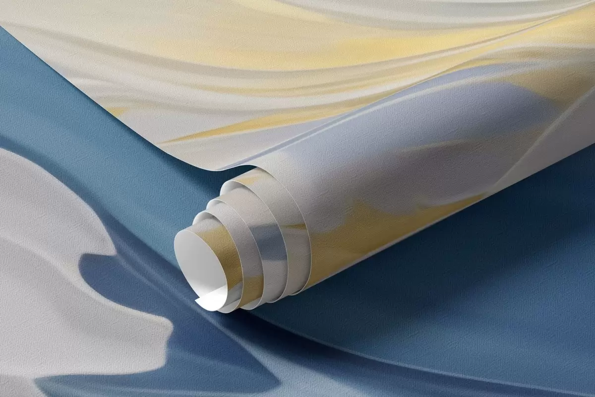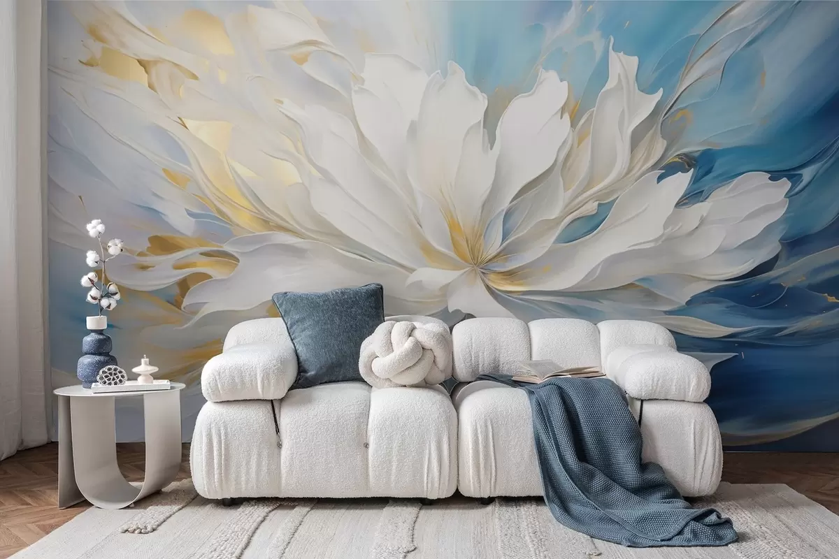 Тапете за зид Велики бели божур у стилу уљаног сликарства на плаво-жутој позадини бр. w09511