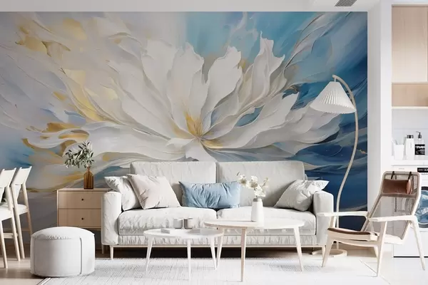 Тапете за зид Велики бели божур у стилу уљаног сликарства на плаво-жутој позадини бр. w09511