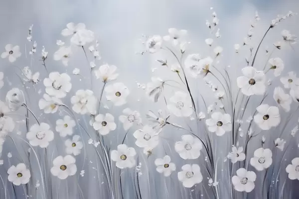 Тапете за зид Бело цвеће на плавим планинама и језеро у стилу уљаног сликарства бр. w09516