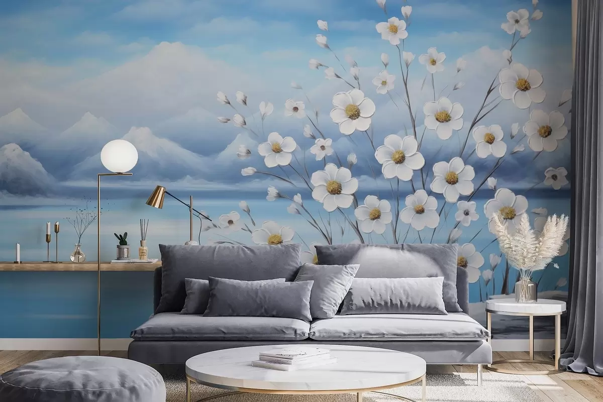 Тапете за зид Бело пролећно цвеће поред леденог језера са снежним планинама у стилу уљаног сликарства бр. w09526