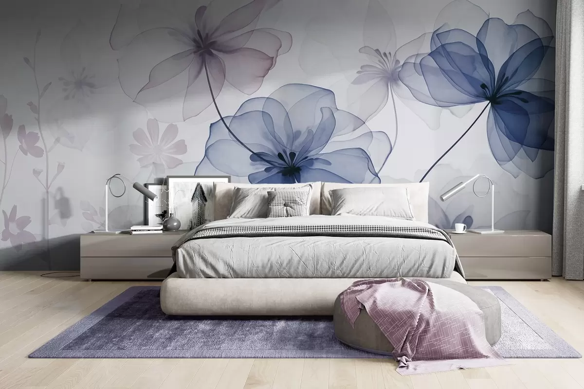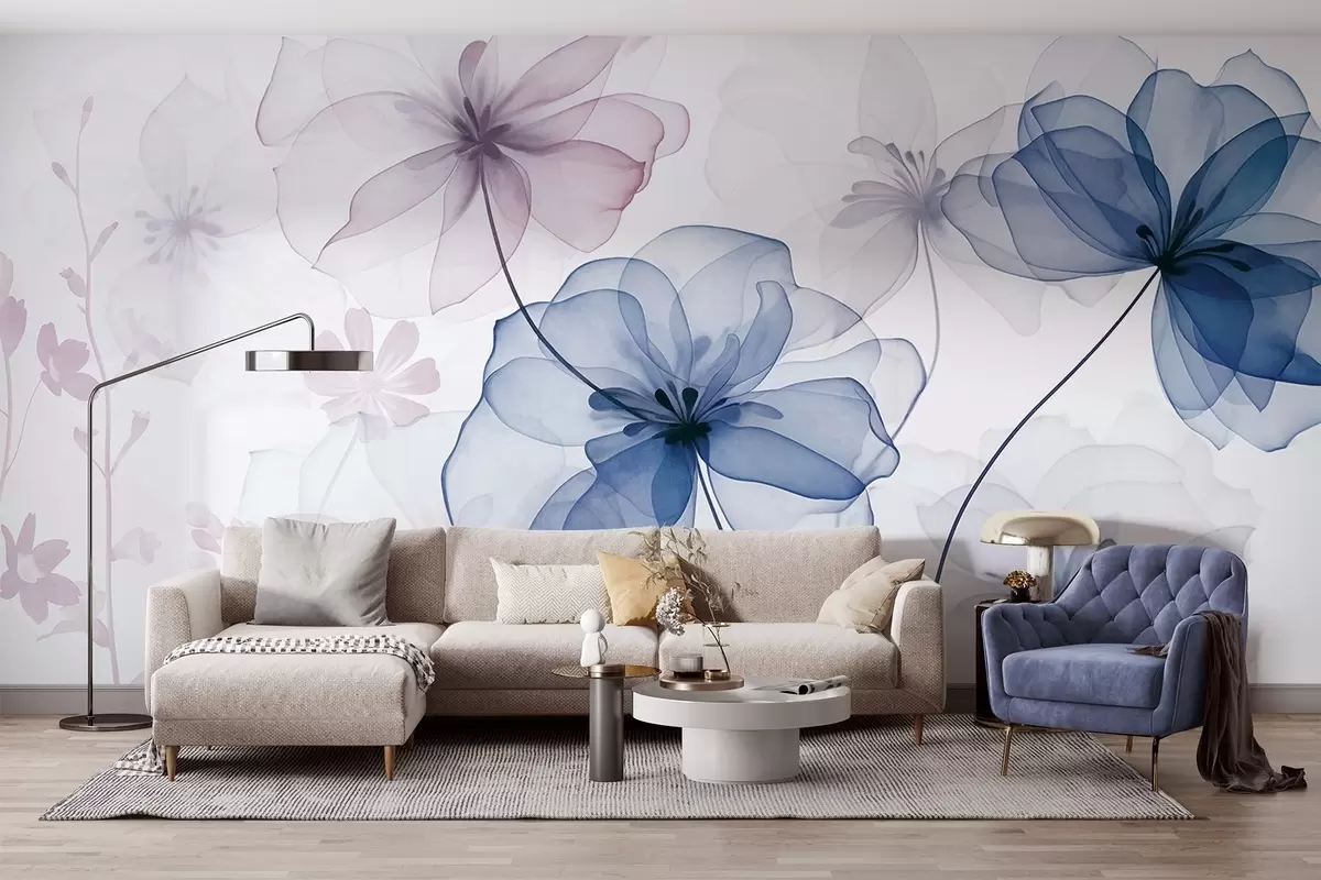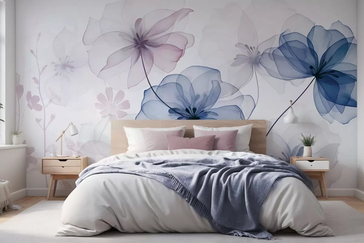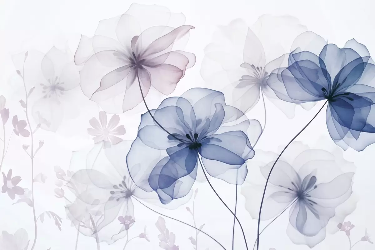 Тапете за зид Провидно цвеће са пригушеним плавим и ружичастим латицама, дугим стабљикама, светлом позадином, меким бојама, текстурираним цветним дизајном бр. w09529v1