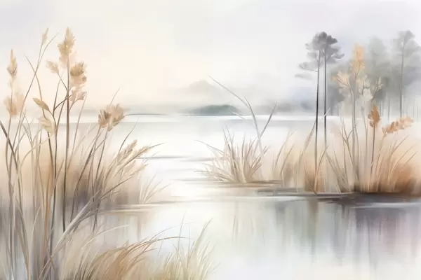 Тапете за зид Пејзаж са језером и високом травом у првом плану, планине у позадини, меке боје, текстурирано бр. w09534