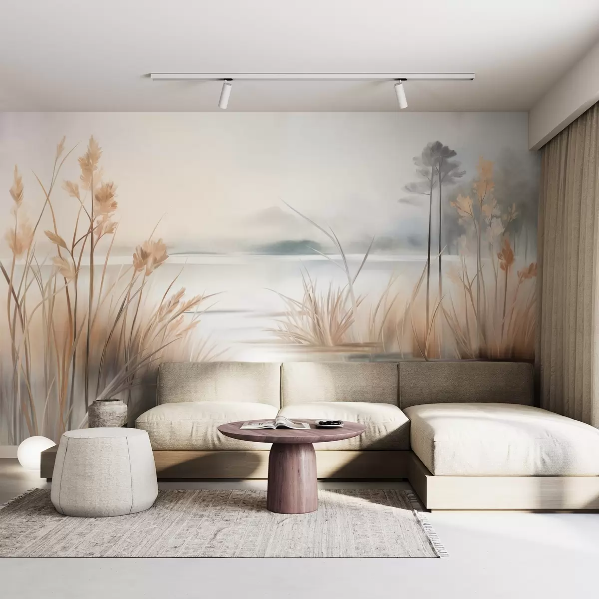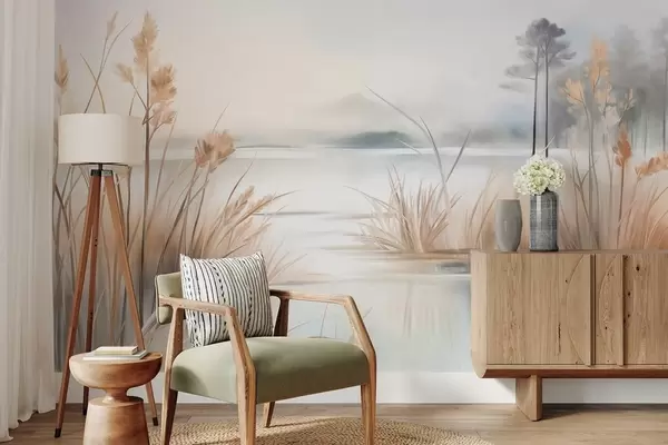 Тапете за зид Пејзаж са језером и високом травом у првом плану, планине у позадини, меке боје, текстурирано бр. w09534