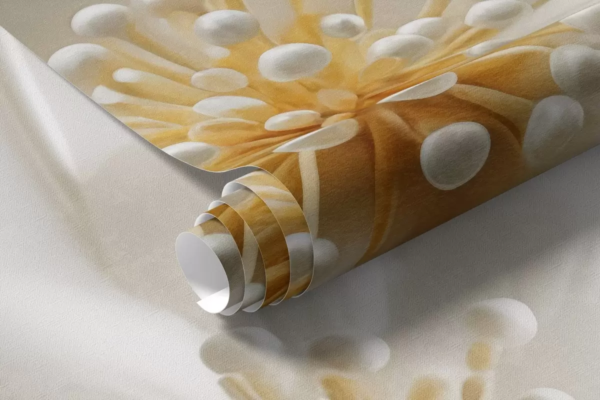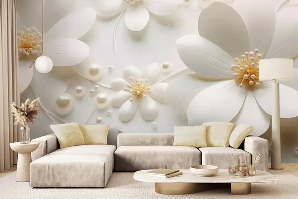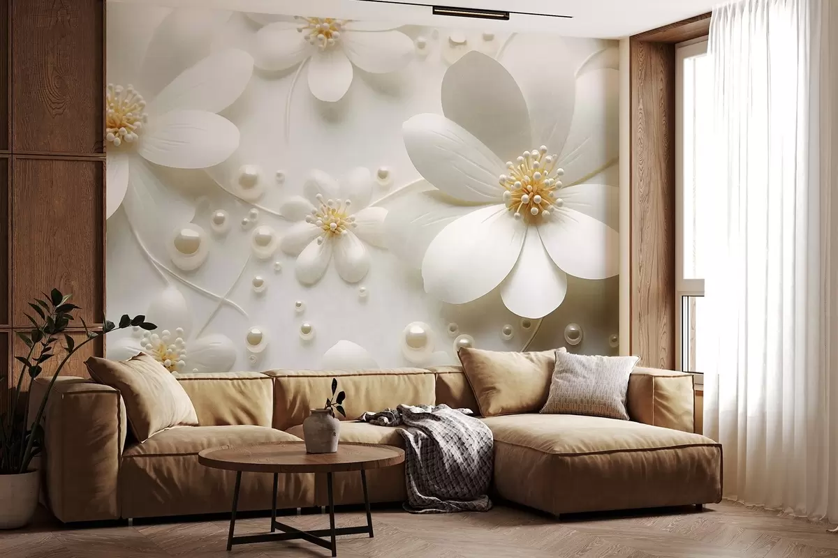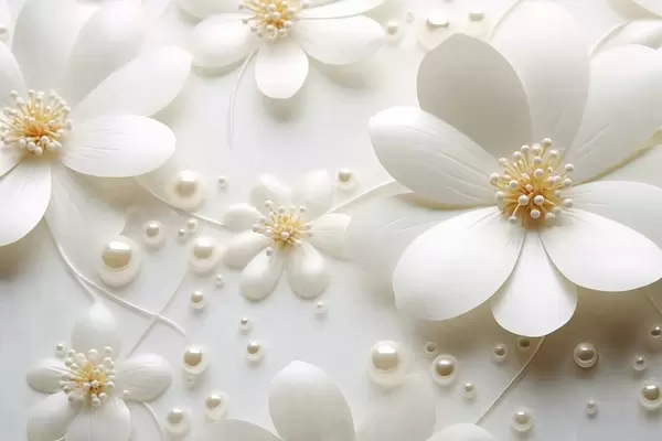 Тапете за зид Бело цвеће са бисерима разбацаним по белој позадини, елегантан и минималистички дизајн, текстурирано бр. w09535