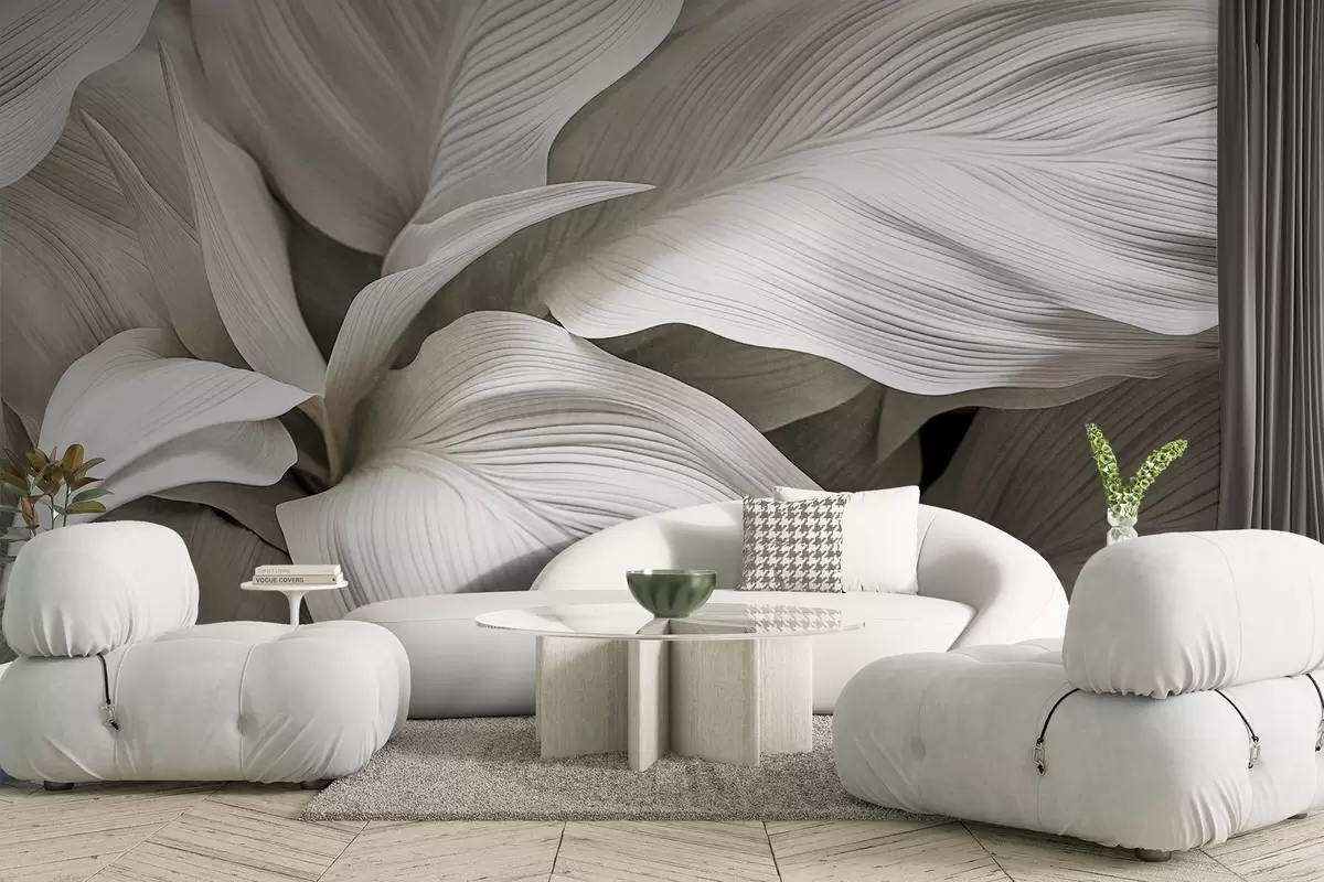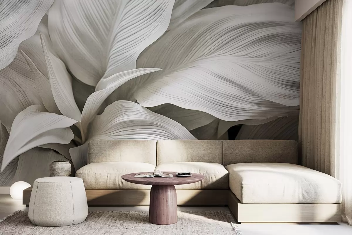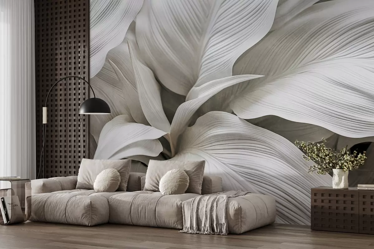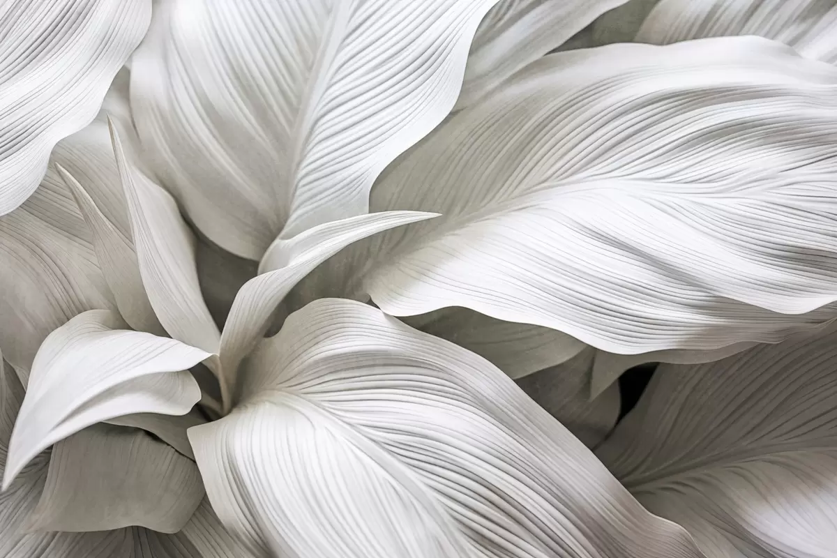 Тапете за зид Велики, текстурирани бели листови са истакнутим жилама, који се преклапају и стварају дубину бр. w09536