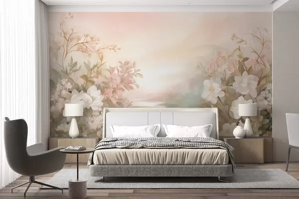 Тапете за зид Пејзаж са реком окруженом цвећем и биљкама, меким бојама, ружичастим небом, акварел текстурираним стилом бр. w09537