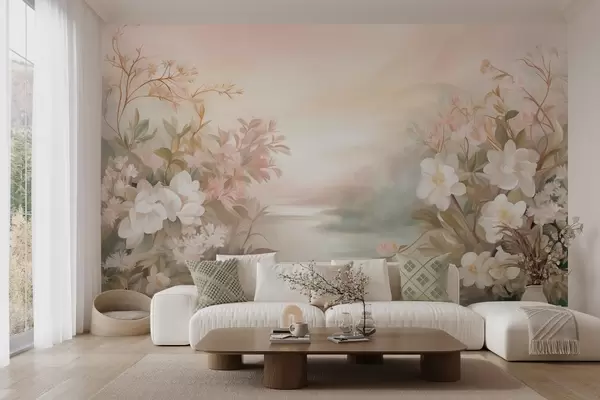 Тапете за зид Пејзаж са реком окруженом цвећем и биљкама, меким бојама, ружичастим небом, акварел текстурираним стилом бр. w09537