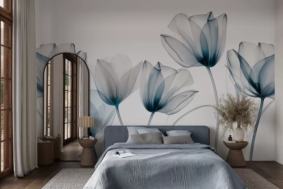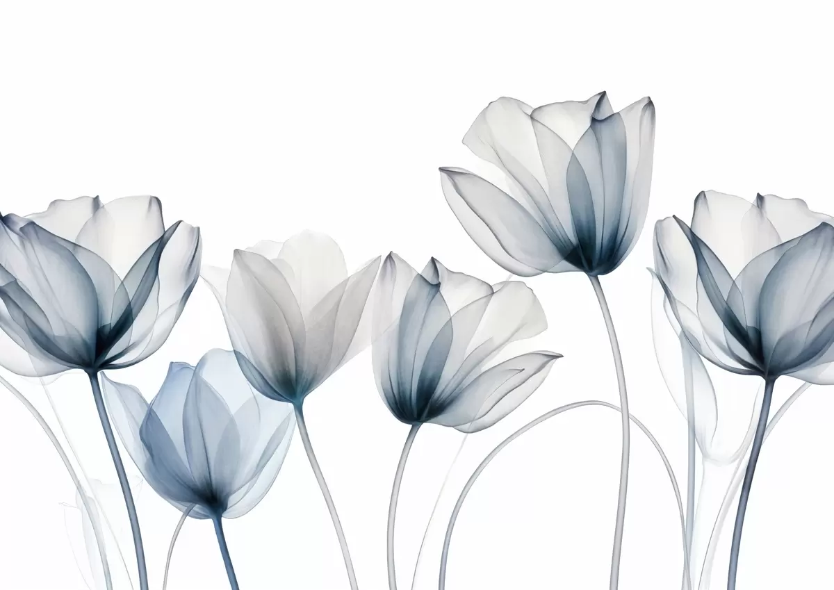 Тапете за зид Прозирни плаво-бели цветови тулипана са дугим стабљикама, на светлој позадини, нежна и текстурирана цветна уметност бр. w09538