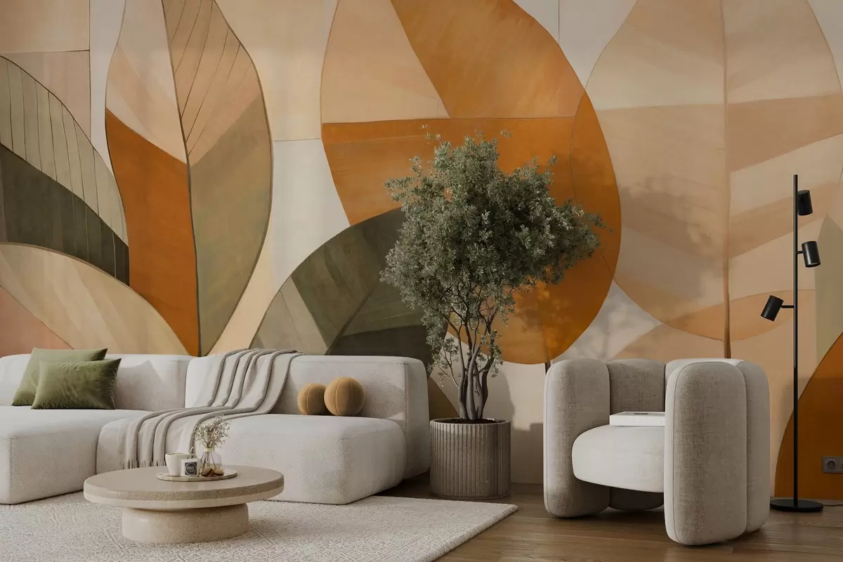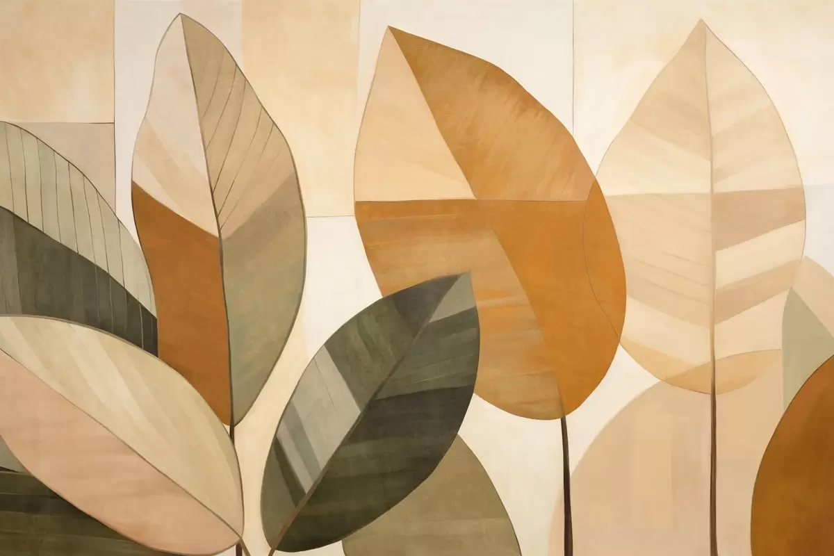 Тапете за зид Апстрактни велики листови у нијансама наранџасте, браон и зелене, текстурирани, распоређени на светлој позадини бр. w09539