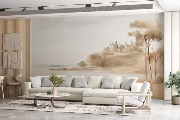 Тапете за зид Пејзаж са замком на брду близу мора, пешчана плажа у првом плану, пригушене боје, текстурирана уметност бр. w09540
