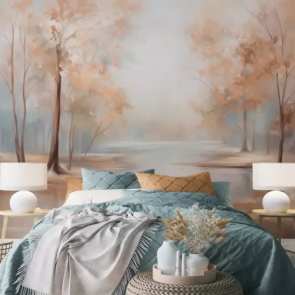 Тапете за зид Јесењи текстурирани пејзаж са дрвећем и реком, меке боје, светла и прозрачна атмосфера, мирна и тиха сцена бр. w09541
