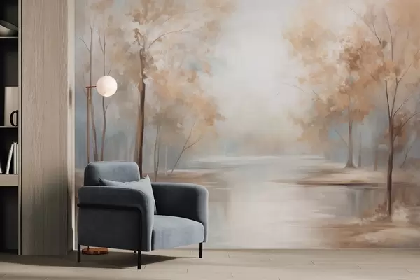 Тапете за зид Јесењи текстурирани пејзаж са дрвећем и реком, меке боје, светла и прозрачна атмосфера, мирна и тиха сцена бр. w09541