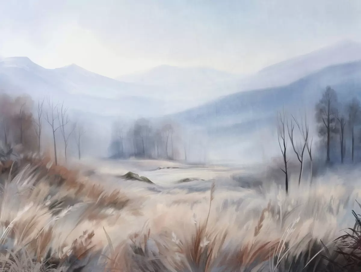 Тапете за зид Текстурирани пејзаж са сувом травом у првом плану и дрвећем у позадини, са планинама у даљини бр. w09542