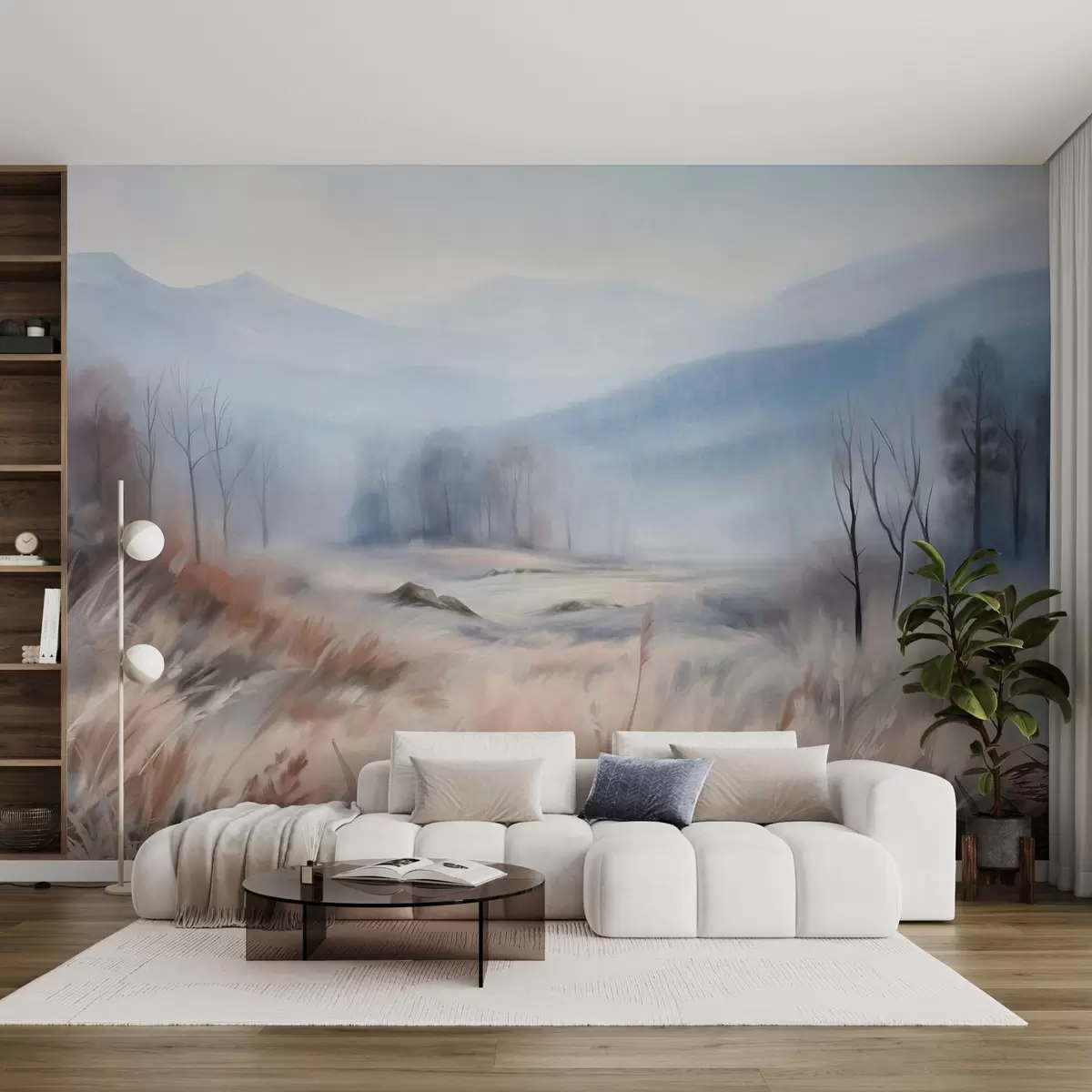 Тапете за зид Текстурирани пејзаж са сувом травом у првом плану и дрвећем у позадини, са планинама у даљини бр. w09542