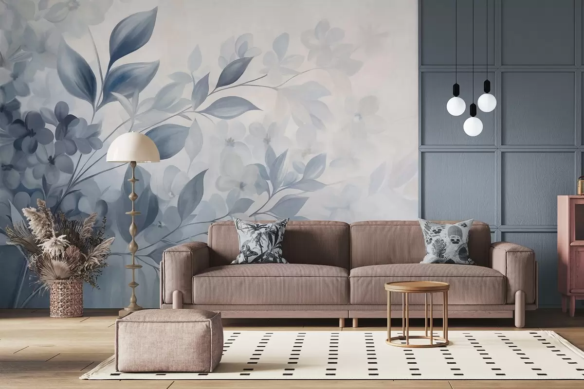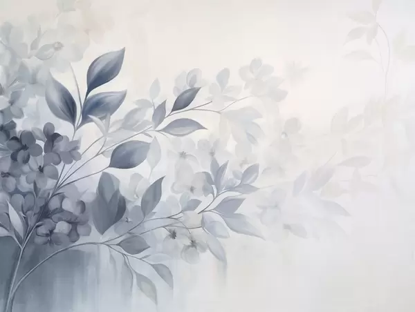Тапете за зид Текстурирана плава и бела грана са цвећем и лишћем које бледи у светлој позадини у стилу акварела бр. w09543