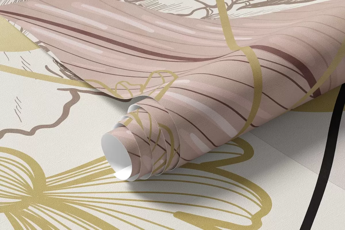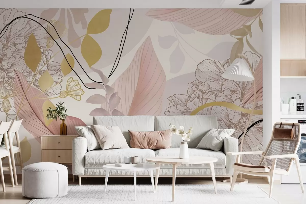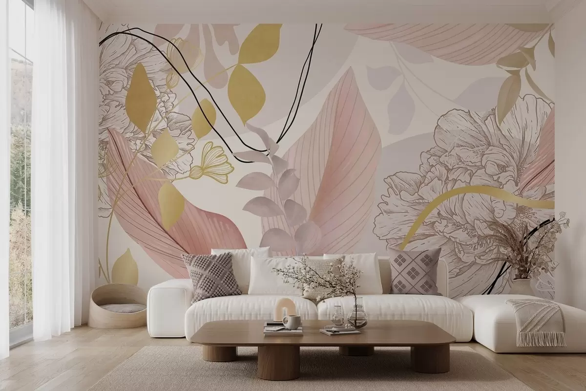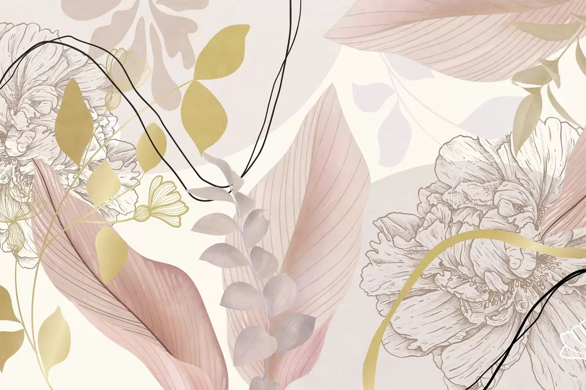 Тапете за зид Апстрактни цветни принт са великим листовима у нијансама пригушене ружичасте, жуте са танким црним линијама и белим цветним обрисима бр. w09544v1