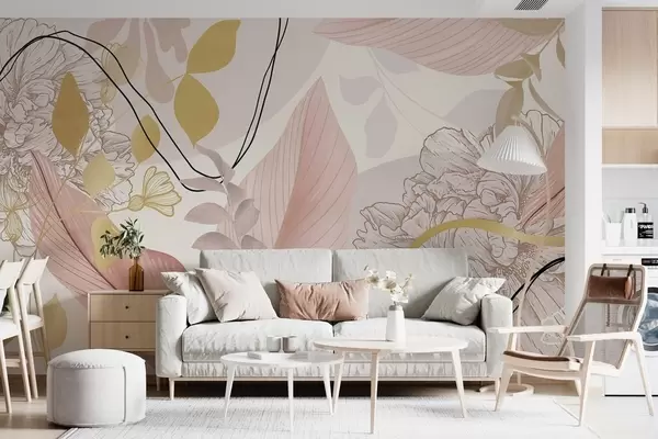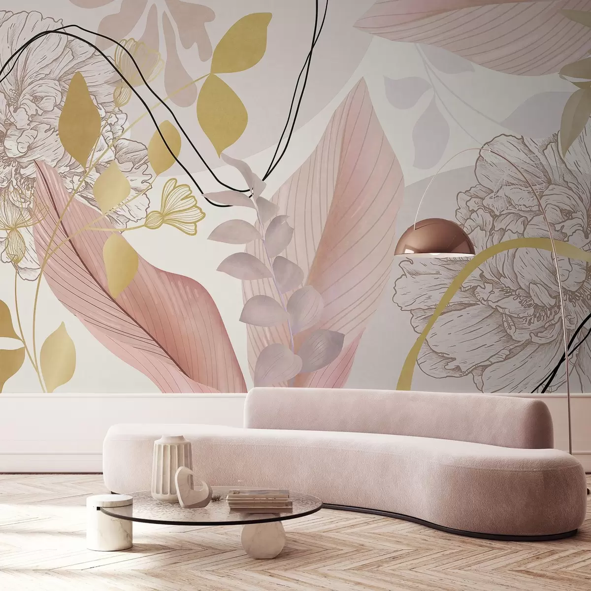 Тапете за зид Апстрактни цветни принт са великим листовима у нијансама пригушене ружичасте, жуте са танким црним линијама и белим цветним обрисима бр. w09544v1