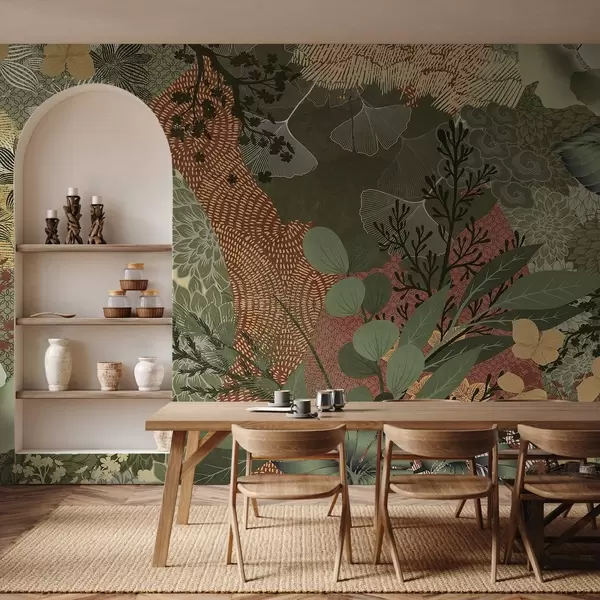 Тапете за зид Апстрактни текстурирани колаж ботаничких елемената са лишћем, цвећем и органским текстурама, у нијансама зелене, браон бр. w09545