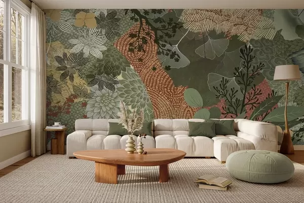 Тапете за зид Апстрактни текстурирани колаж ботаничких елемената са лишћем, цвећем и органским текстурама, у нијансама зелене, браон бр. w09545