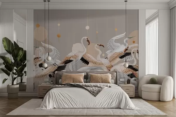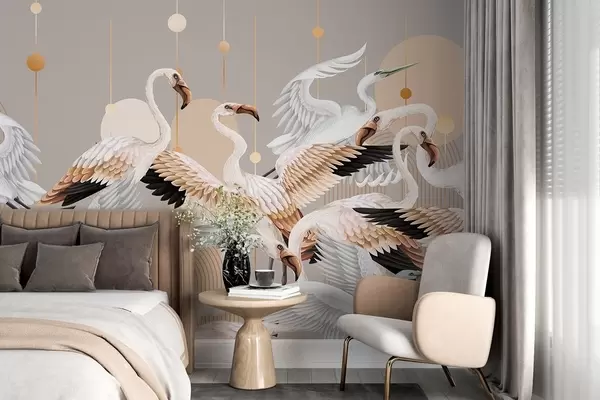 Тапете за зид Јато белих фламинга са нежним крилима, на неутралној позадини са жутим линијама и круговима бр. w09546v1