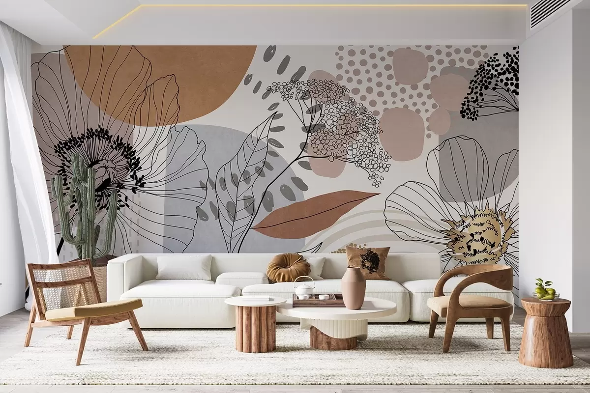 Тапете за зид Апстрактни цветни текстурирани отисак са линијском уметношћу цвећа, лишћа и органских облика у пригушеним смеђим, беж и сивим тоновима бр. w09548