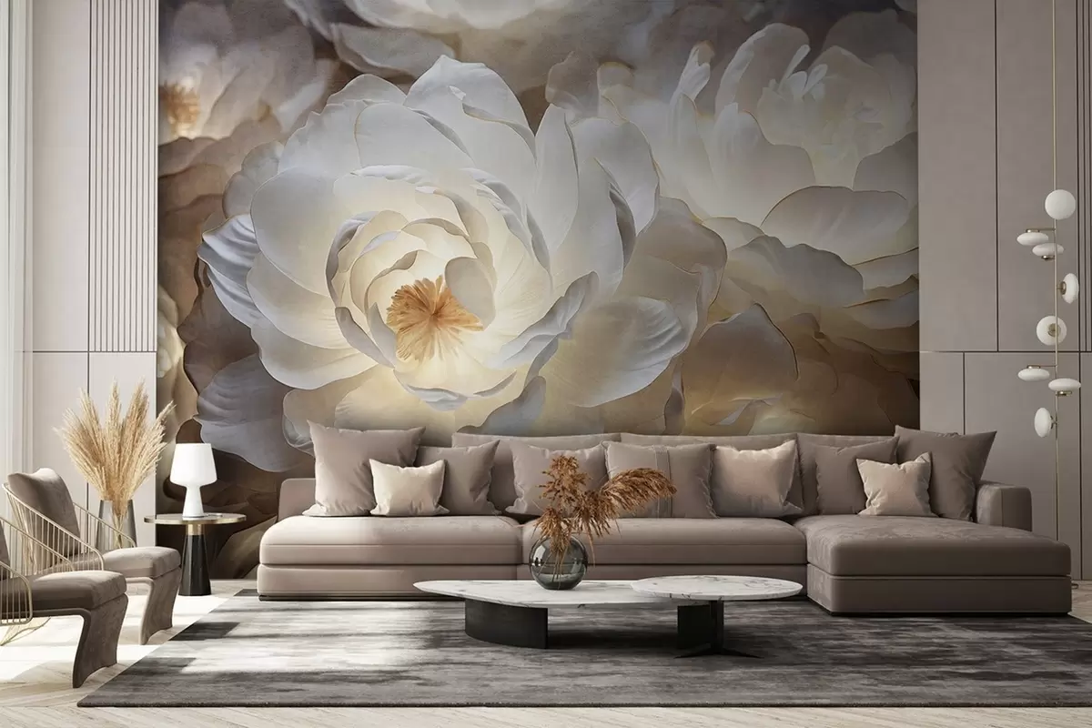 Тапете за зид Велики, бели цветови фантастичног божура са жутим средиштем, меким осветљењем и нежним, текстурираним слојевитим латицама бр. w09550