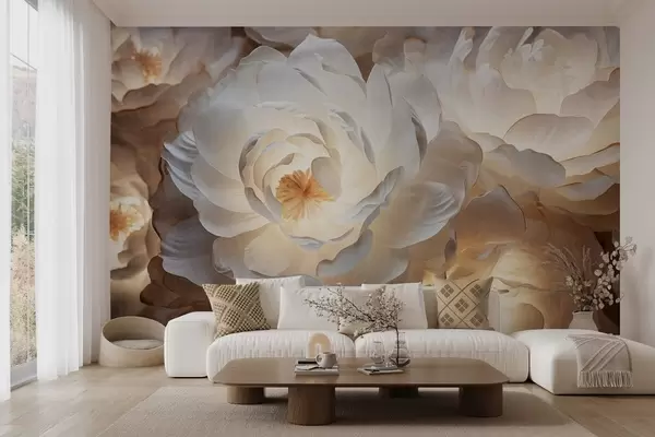 Тапете за зид Велики, бели цветови фантастичног божура са жутим средиштем, меким осветљењем и нежним, текстурираним слојевитим латицама бр. w09550