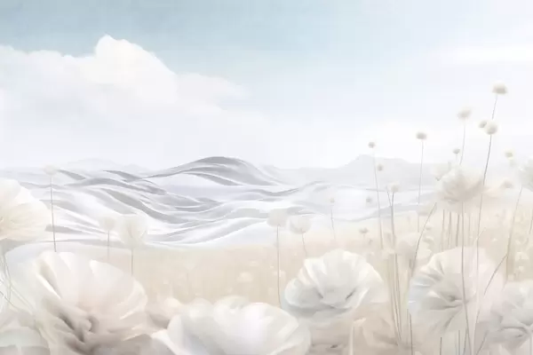 Тапете за зид Текстурирано поље кремастих макова са валовитим брдима под бледоплавим небом са меким облацима, пастелним бојама бр. w09553