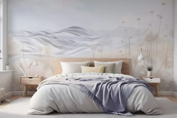 Тапете за зид Текстурирано поље кремастих макова са валовитим брдима под бледоплавим небом са меким облацима, пастелним бојама бр. w09553
