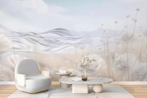 Тапете за зид Текстурирано поље кремастих макова са валовитим брдима под бледоплавим небом са меким облацима, пастелним бојама бр. w09553