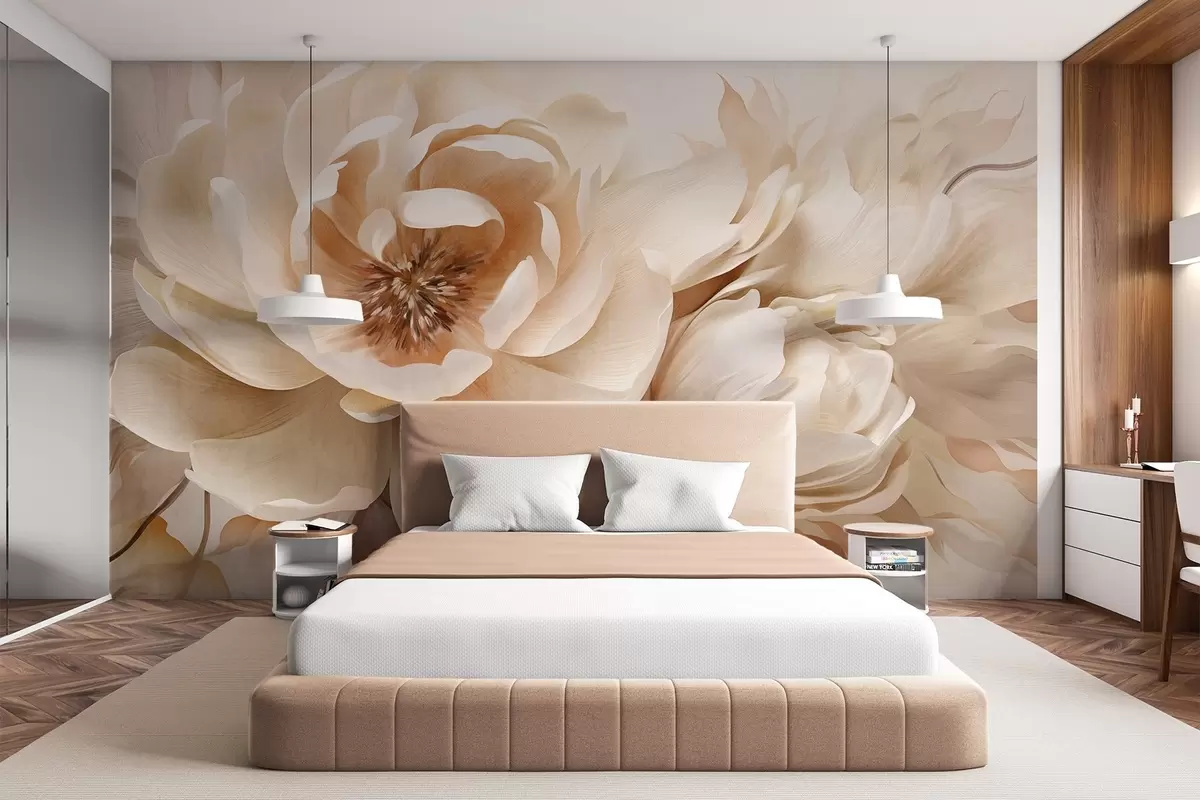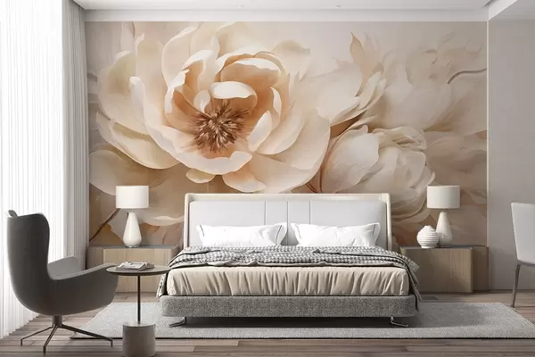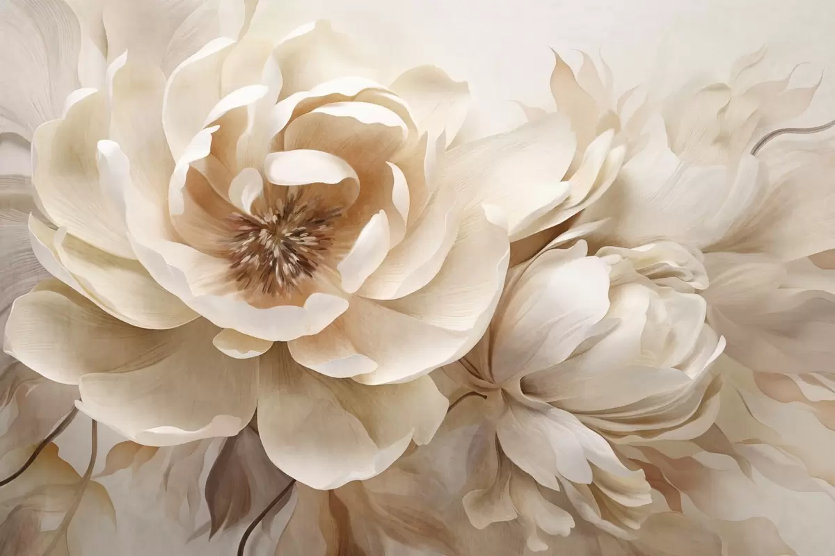 Тапете за зид Кремасти текстурирани божури са смеђим средиштем и листовима на замућеној светлој апстрактној позадини бр. w09554
