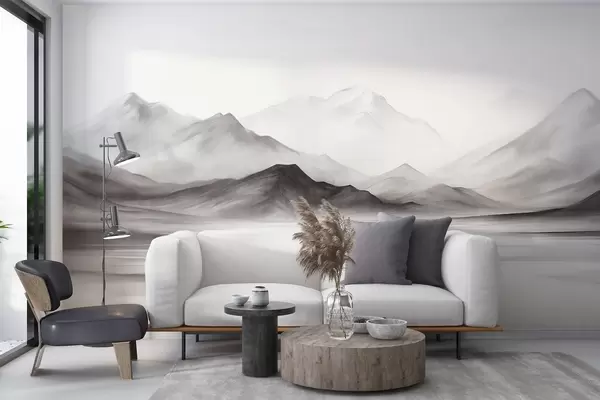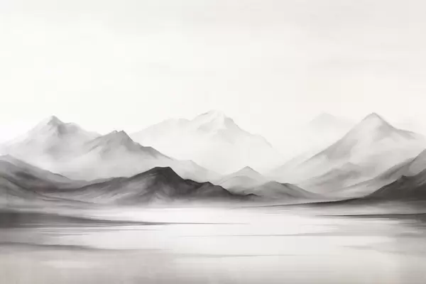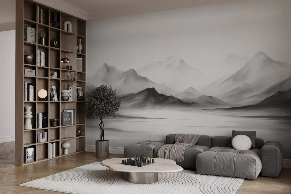 Тапете за зид Монохроматски текстурирани пејзаж са магловитим планинама и језером у првом плану бр. w09555