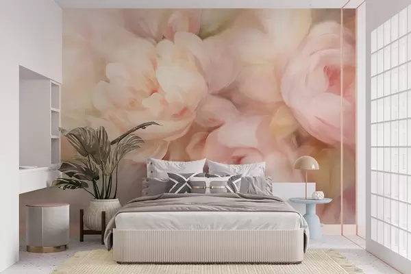 Тапете за зид Бледо ружичасти и кремасти божури са нежном, сликарском имитацијом потеза четкицом, стварајући текстурирани цветни аранжман бр. w09556