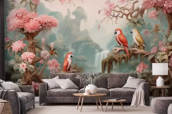 Тапете за зид Бајковита тропска шума са папагајима, цветајућим дрвећем са ружичастим цветовима и водопадом бр. w09580