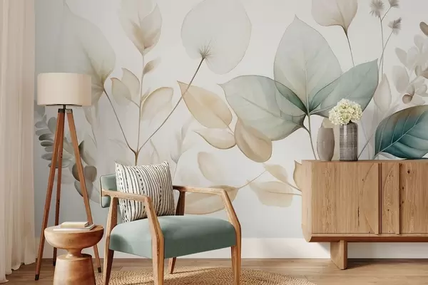 Тапете за зид Текстурирани провидни листови у пригушеним тоновима беж и тиркизне боје, са нежним стабљикама на мекој, светлој позадини бр. w09583